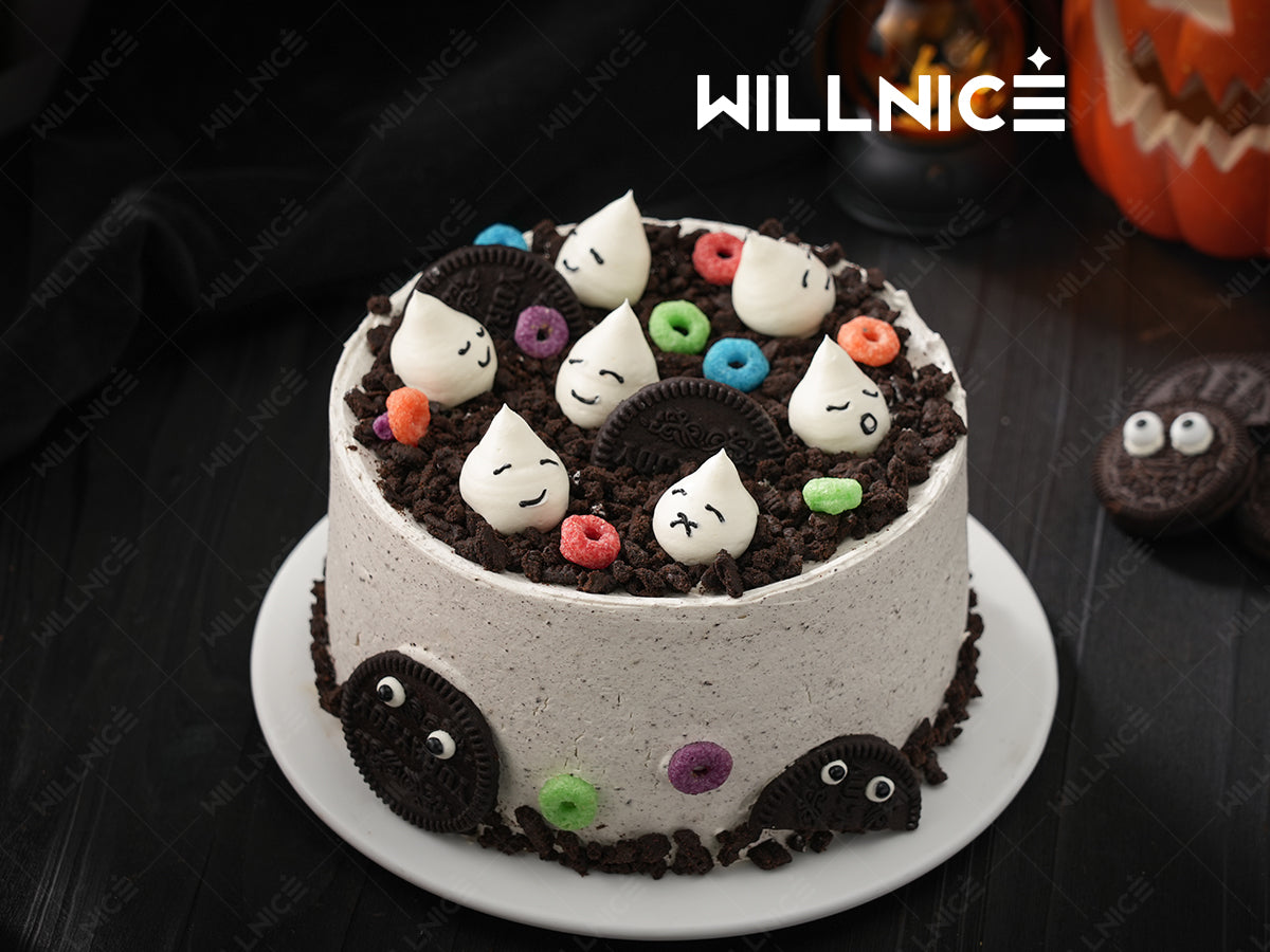 奧利奧碎鋪滿整個蛋糕表面,打造奇幻黑魔法土壤!可愛小鬼造型奶油潛伏其中,彩色谷物圈點亮魔法陣,側面奧利奧餅幹長出搞怪眼睛,細節滿滿!6英寸忌廉蛋糕內含新鮮水果夾心,萬聖派對必備。